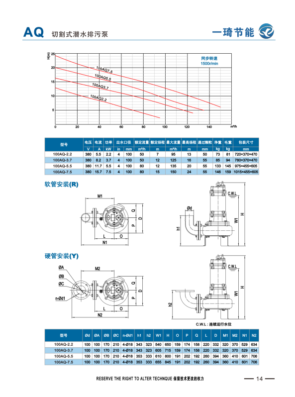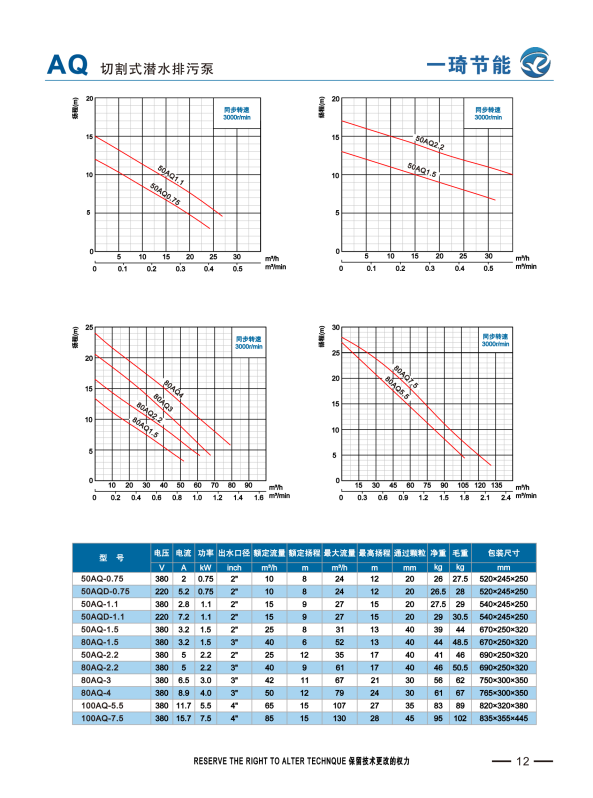AQ系列潜水切割泵为大流量低扬程,适用于名业含有杂物等污水,具有热保护装置,大通道叶轮,重载式潜水电机,全扬程不过载。