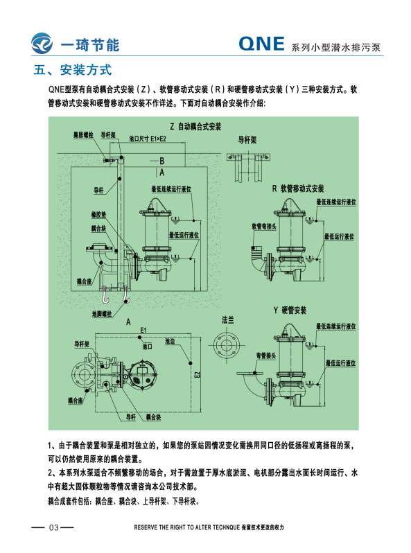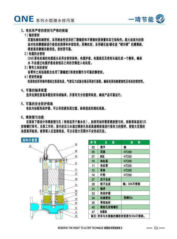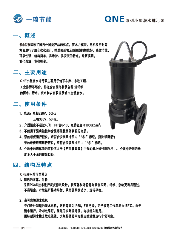 QNE小型潜水排污泵系列是用于市政排污、农业畜牧、环保污水治理等场境,具有安装方便,轻便,且带有自喷射搅拌功能。重载式潜水电机,全扬程不过载。
