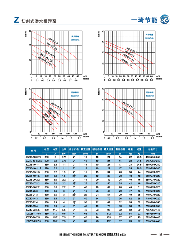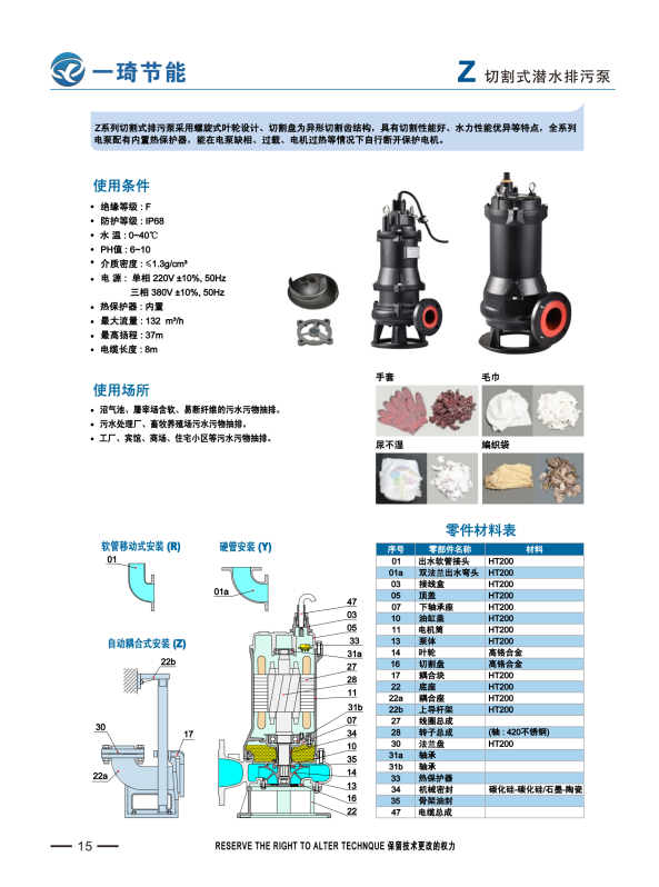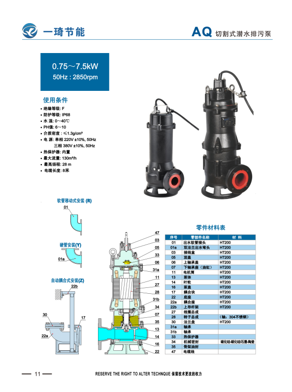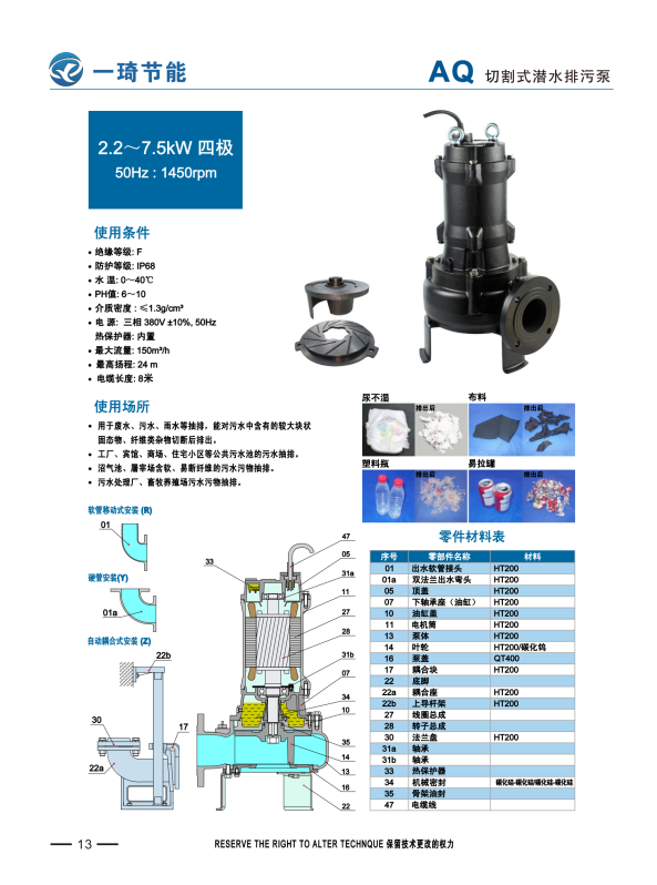 Z系列潜水切割泵为低流量高扬程,具有和AQ同样的功能,叶轮和切割盘均为合金材质,使用寿命长。